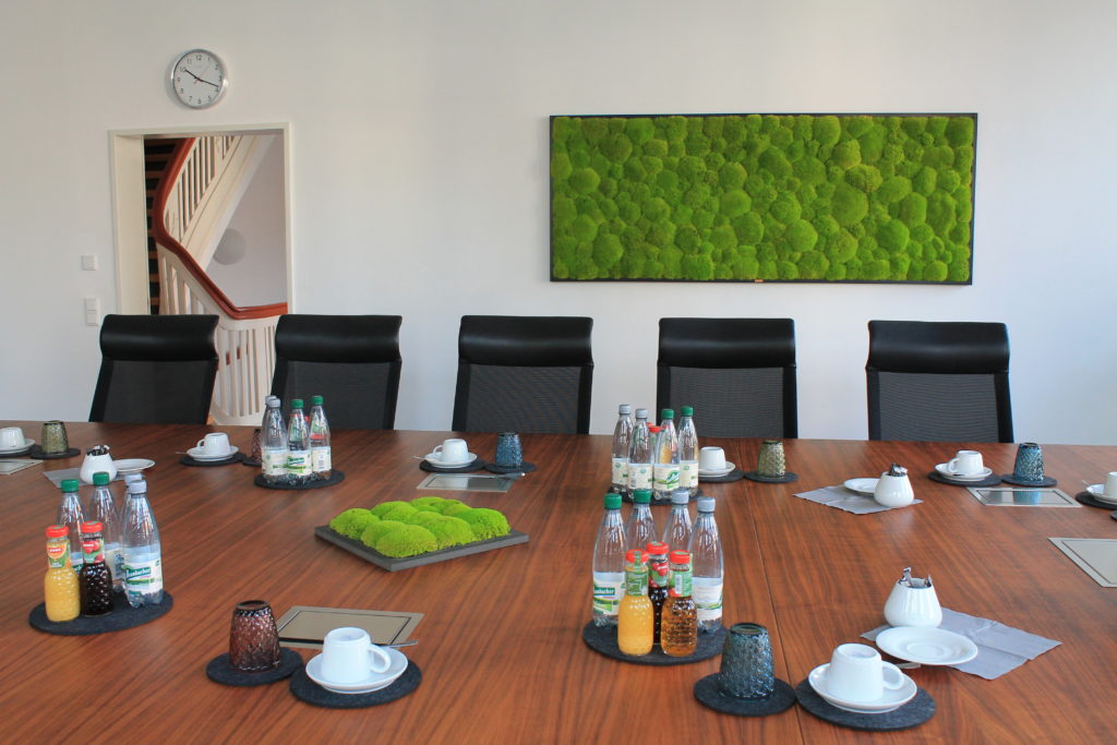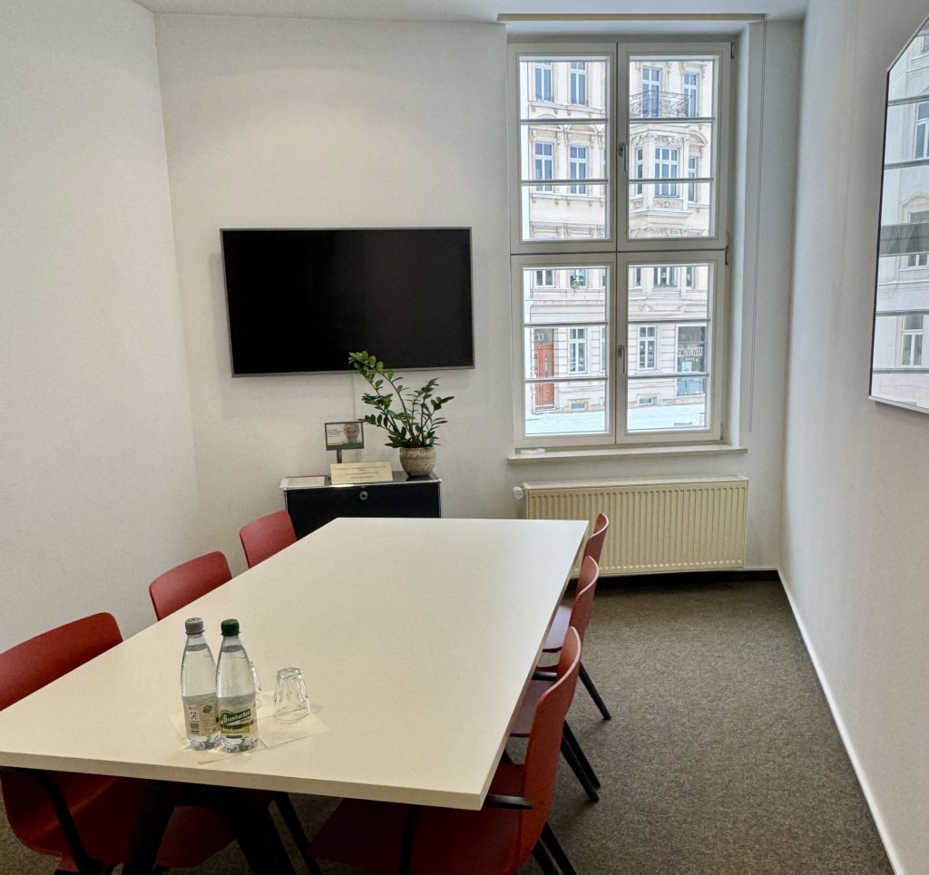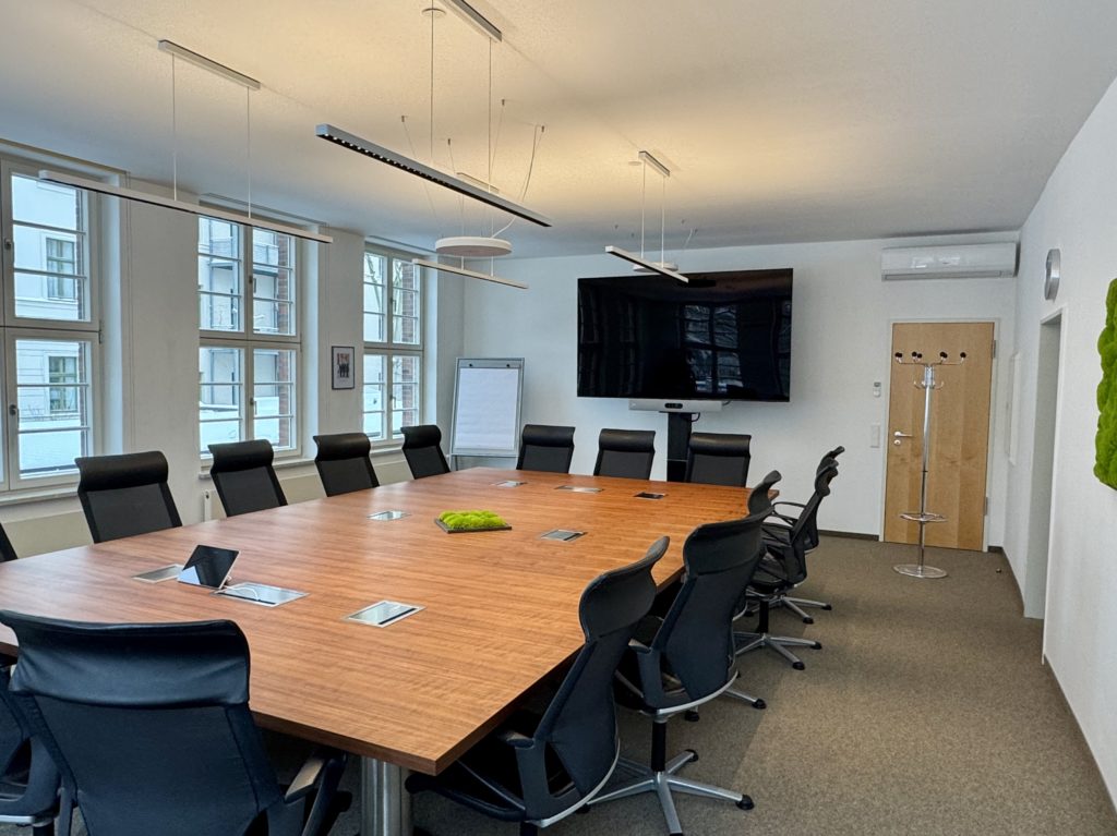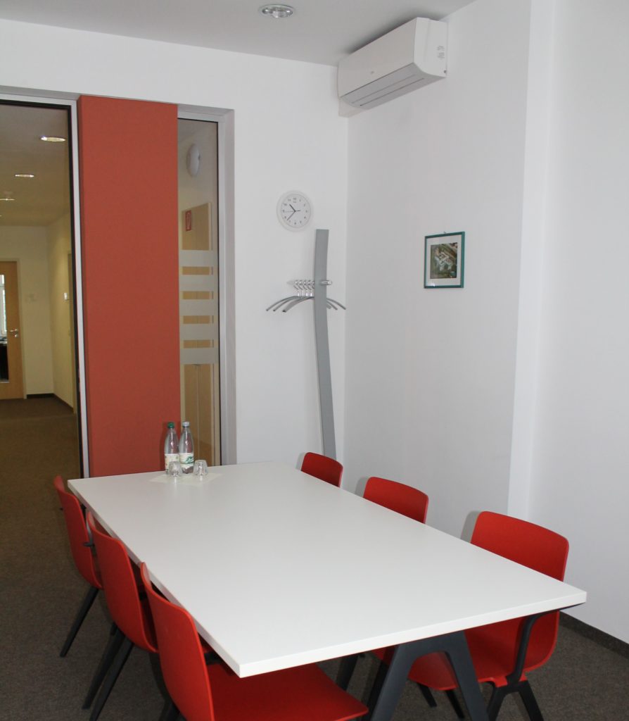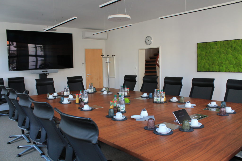 - Flexible Bestuhlung, z. B. U-Form (max. 18 Pers.), parlamentarisch (max. 70 Pers.), Reihenbestuhlung (max. 80 Pers.)